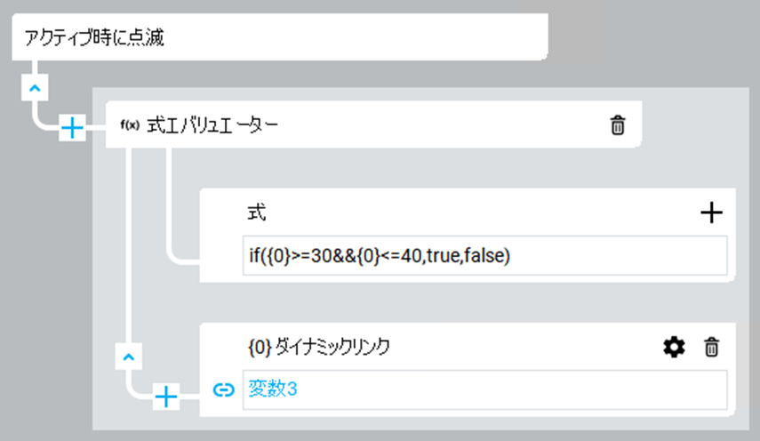 変数値が 30 〜 40 の場合、アクティブなときに緑色の LED オブジェクトが点滅します