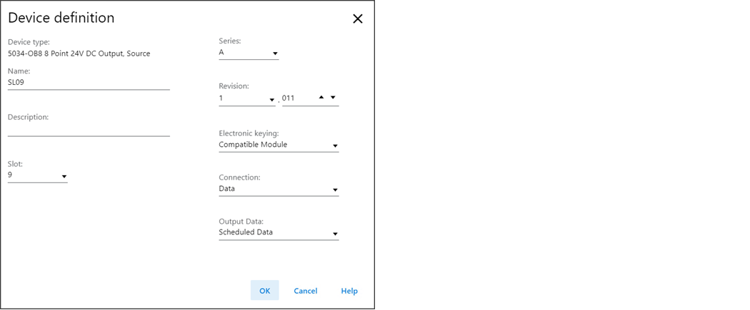 Slot | 장치가 있는 슬롯 번호를 지정하십시오. 플랫폼에 따라 1과 최대 I/O 장비 수 사이의 슬롯만 유효합니다. 장치가 생성되면 슬롯 번호는 기본적으로 첫 번째 사용 가능한 슬롯 위치로 설정됩니다. 컨트롤러가 더 작은 최대 I/O 카운트를 지원하는 값으로 변경되면 현재 슬롯 값이 더 이상 유효하지 않을 수 있습니다. | 1~32 |