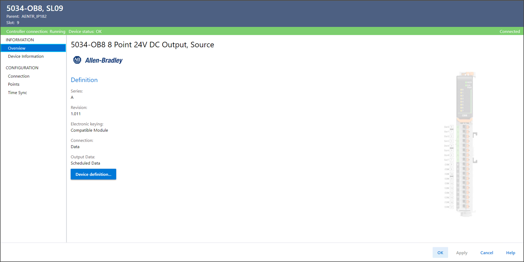 Connection | 장치와 컨트롤러 간에 전송되는 데이터 유형을 지정합니다. Listen Only Data의 경우, 컨트롤러가 장치에 구성이나 출력 데이터를 전송하지 않고도 컨트롤러와 장치가 통신을 설정합니다. 완전한 입력 데이터 연결이 설정되지만 소유자 컨트롤러와 장치 사이의 연결에 따라 달라집니다. |