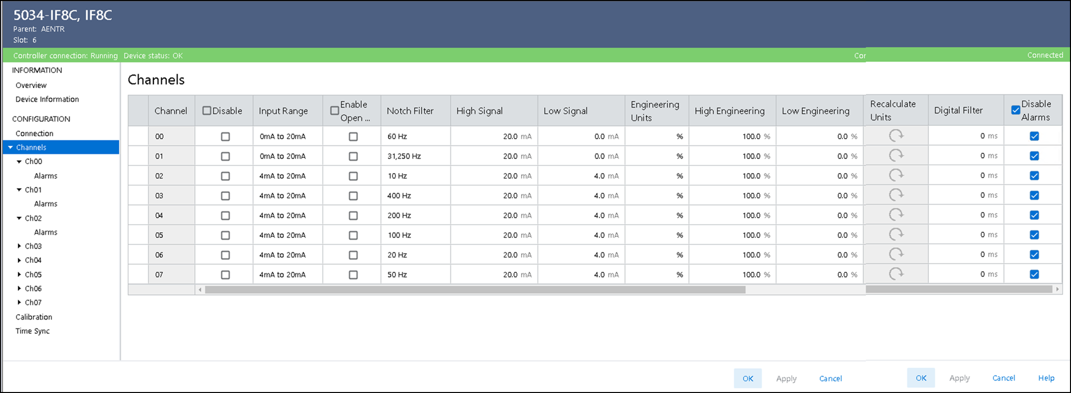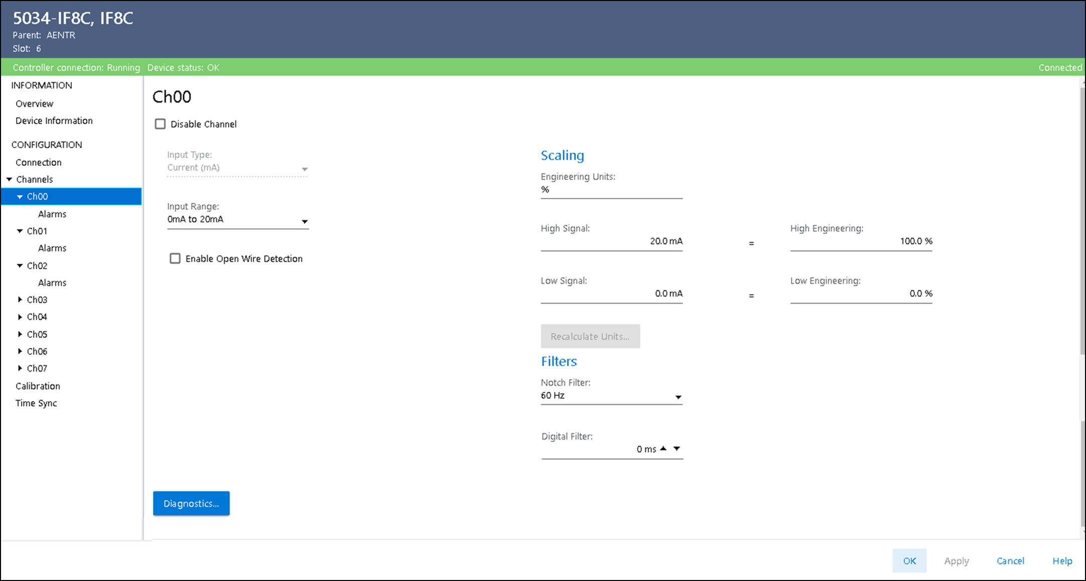 모듈과 연결되었을 때 채널 진단 정보를 표시합니다. 모듈과 온라인 상태인 경우, Chxx 보기의 Diagnostics 를 선택하여 진단 정보를 확인합니다.
