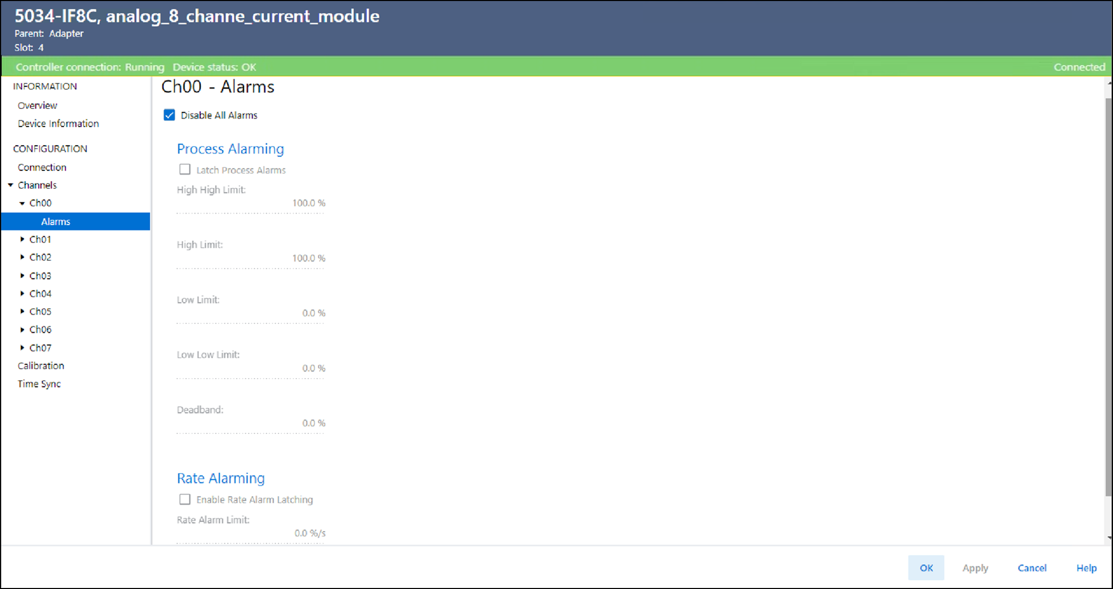 입력 모듈의 각 채널에는 Alarms 보기가 있습니다. 이 보기에서 다음 작업을 수행할 수 있습니다.