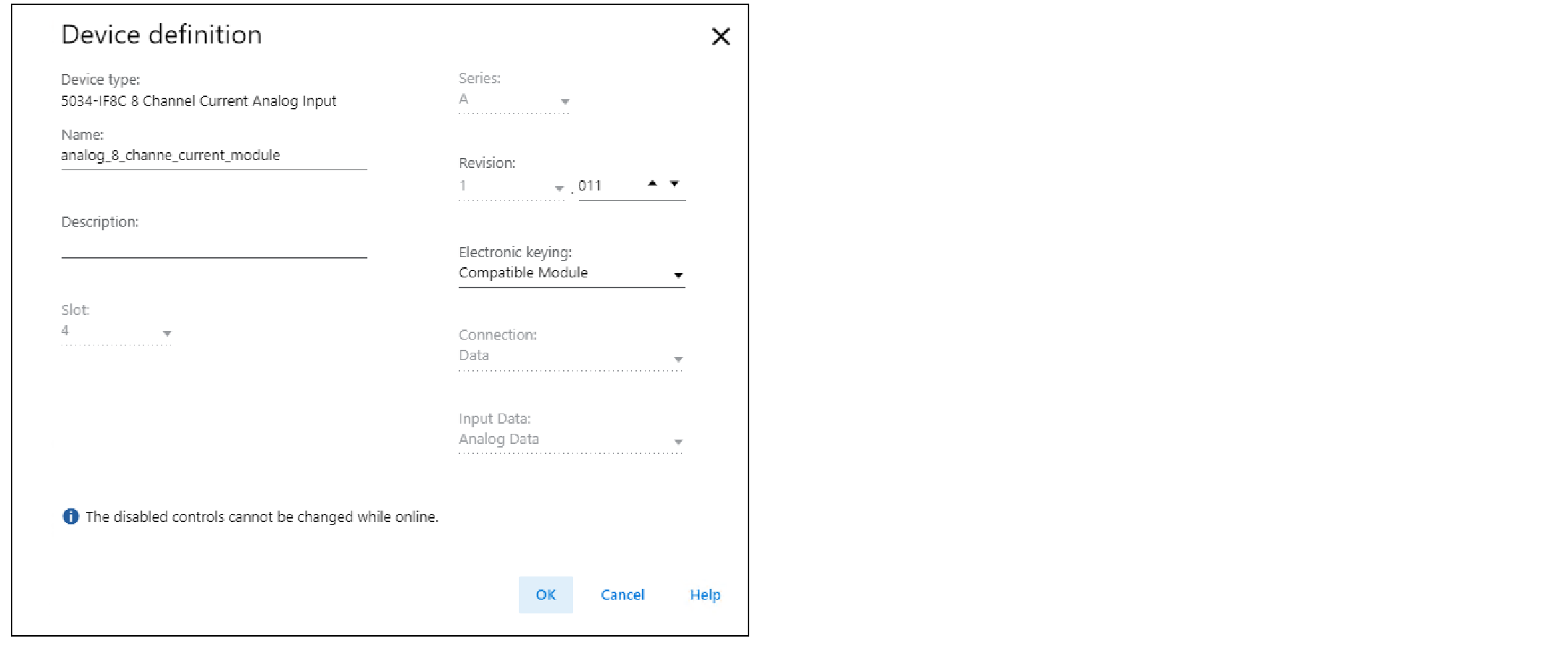 Electronic Keying | 장치에 사용되는 Electronic Keying을 정의합니다. Electronic Keying은 프로젝트에 정의되어 있는 장치를 설치된 장치와 비교합니다. Keying이 실패한 경우 폴트가 발생합니다. Electronic Keying에 대한 정보는 Logix 5000 제어 시스템 애플리케이션의 Electronic Keying 기술서(Publication LOGIX-AT001)를 참조하십시오. |