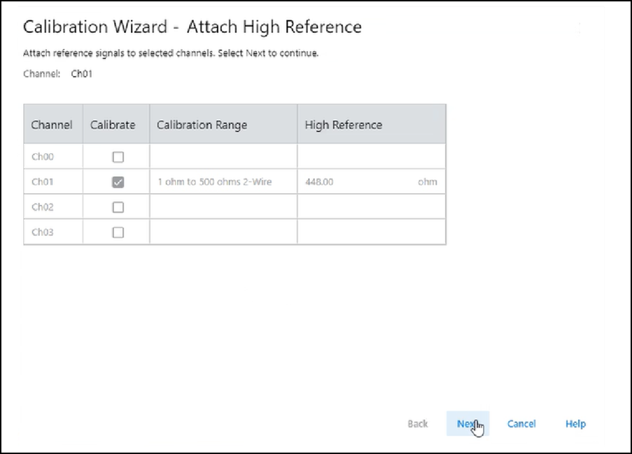 - Attach High Reference 대화상자가 나타나면 캘리브레이션 중인 채널에 448 Ω 저항을 연결합니다.
