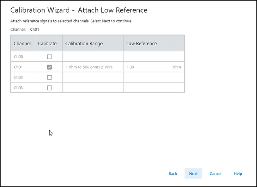 - Attach Low Reference 대화상자가 나타나면 캘리브레이션 중인 채널에 1 Ω 저항을 연결합니다.