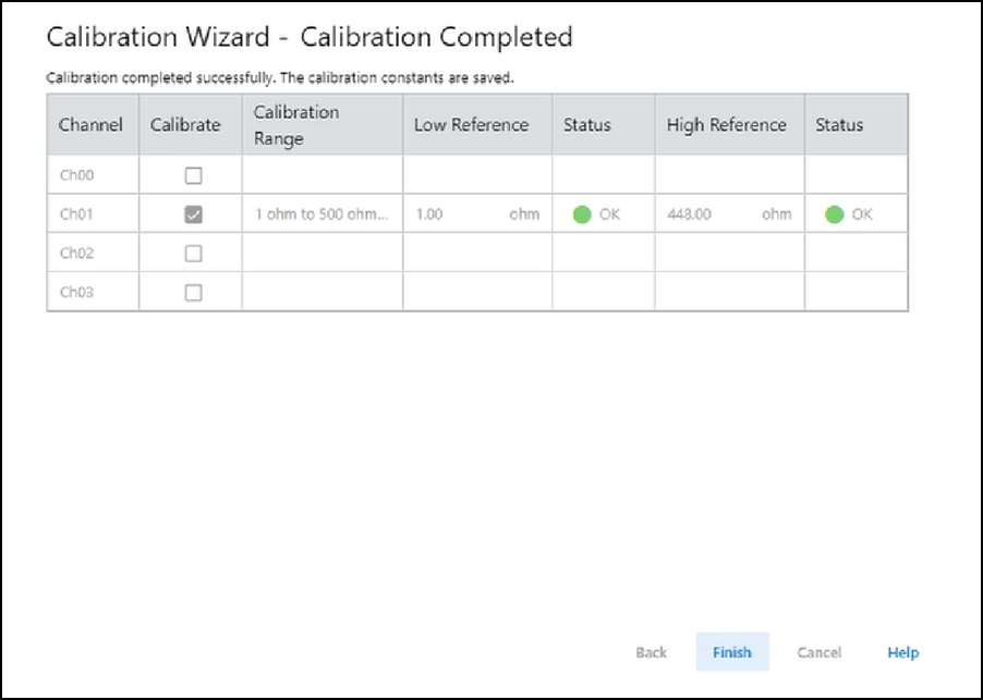 - Next를 선택하십시오.High Reference Results 대화상자가 나타나면서 캘리브레이션 된 채널의 상태를 나타냅니다.