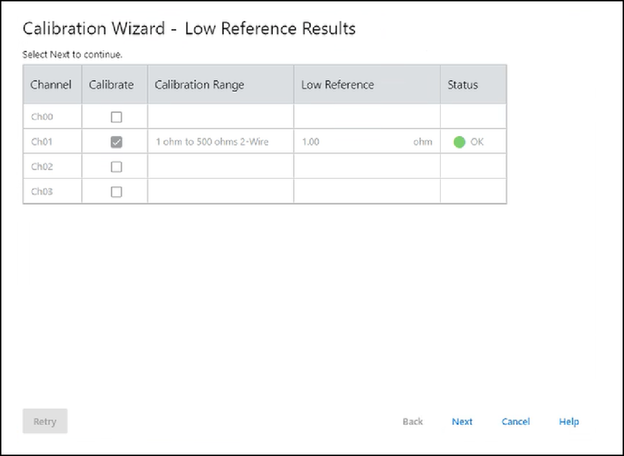 - Next(다음)를 선택하십시오.Low Reference Results 대화상자가 나타나면서 캘리브레이션 된 채널의 상태를 나타냅니다.