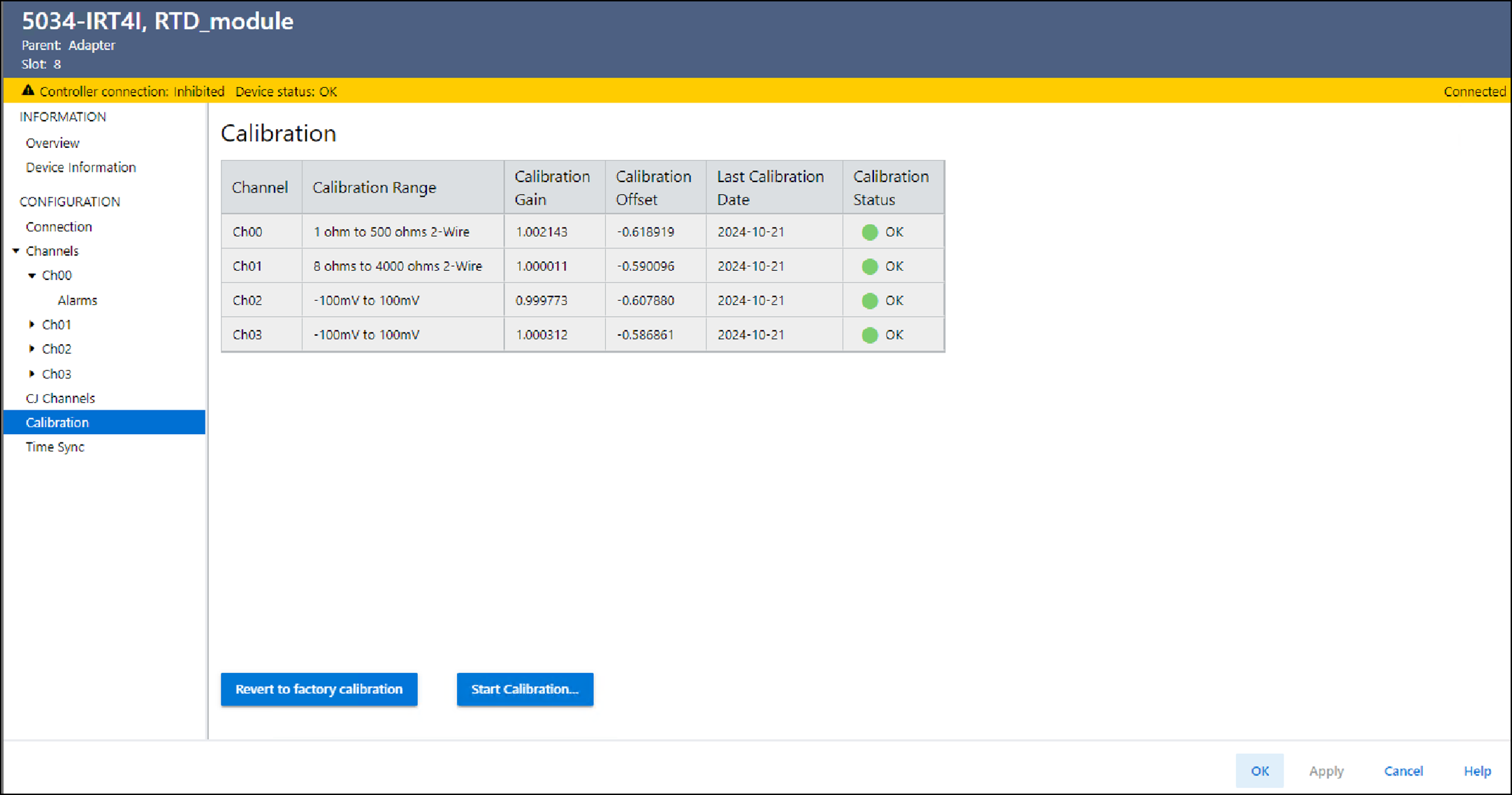 Calibration 보기는 모듈의 모든 채널에 대한 캘리브레이션 정보를 제공합니다. 이 보기에서 모든 채널에 대해 다음 작업을 수행할 수 있습니다.
