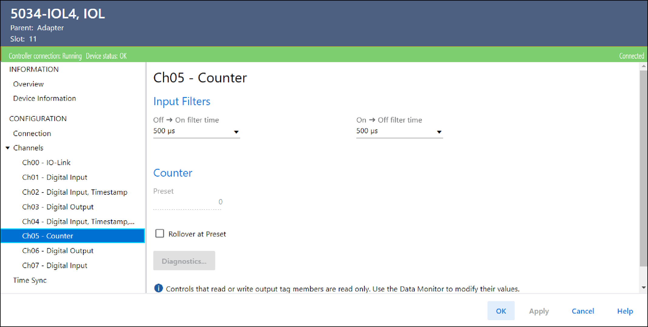 이 창은 채널이 “디지털 입력, 카운터”로 설정된 경우에 사용 가능합니다. 프로젝트가 온라인 상태일 때만 특정 작업을 수행할 수 있습니다.