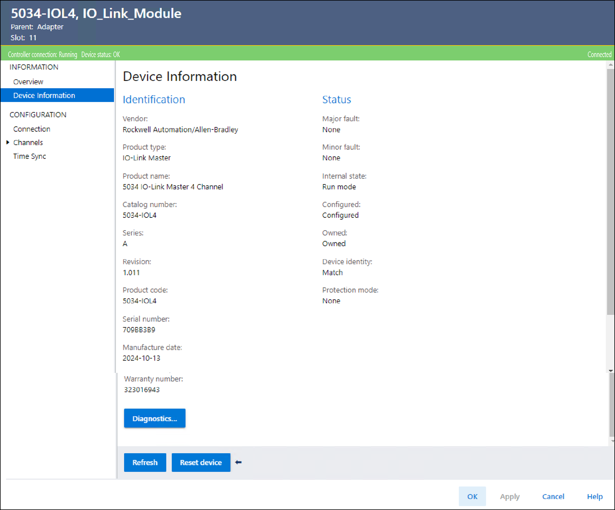 Device Information을 사용하여 장치가 온라인 상태일 때 장치 및 상태 정보를 볼 수 있습니다.