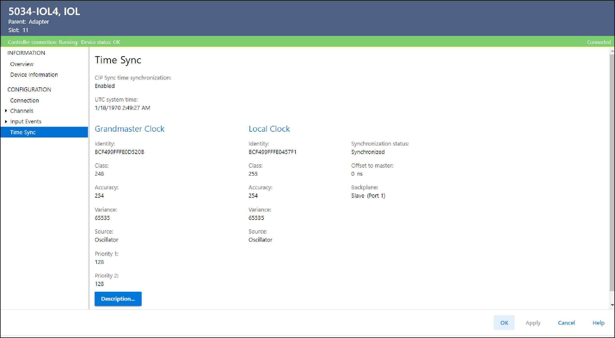Time Sync 보기는 읽기 전용이며 프로젝트가 온라인일 때 모듈에 대한 CIP Sync 상태 정보를 표시합니다. Time Sync(시간 동기화) 카테고리에는 아래의 정보가 표시됩니다.