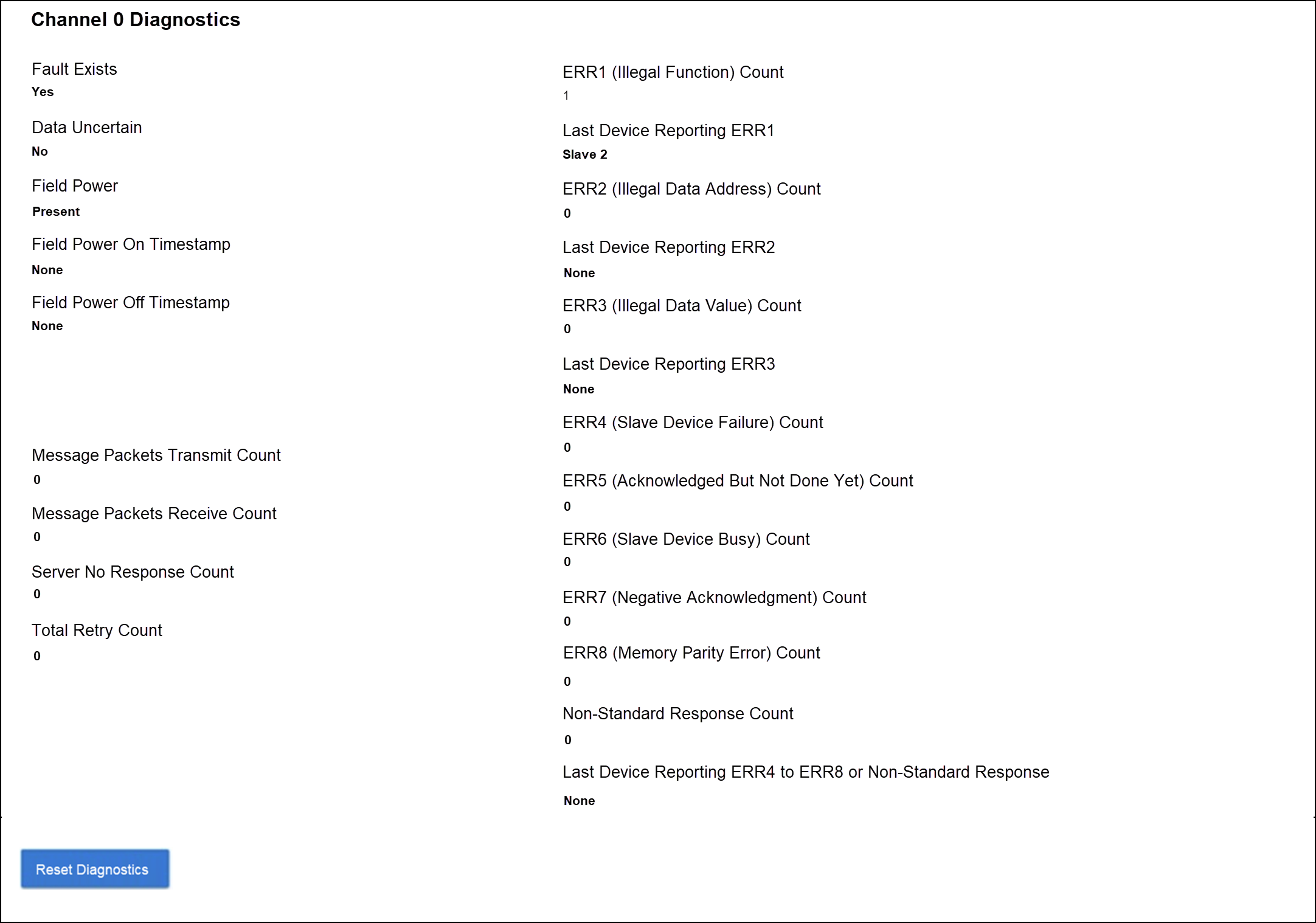 Diagnostics를 선택하면 Modbus Master 채널의 진단 정보를 볼 수 있습니다.