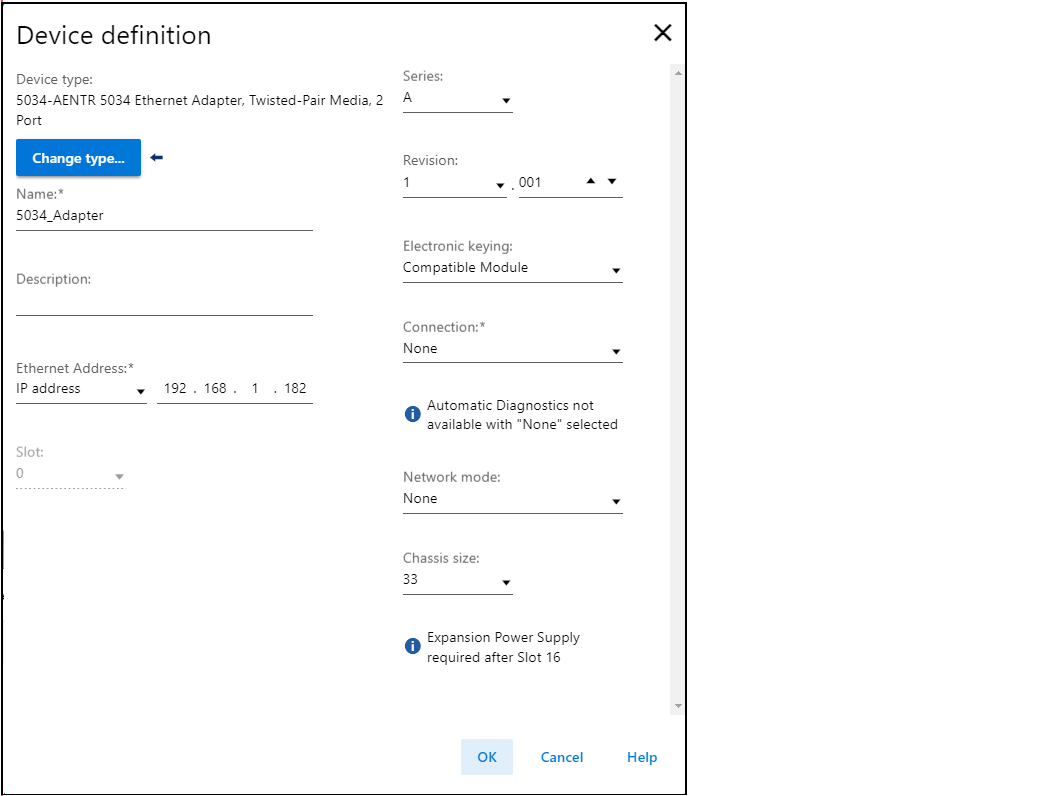 - 어댑터의 해당 펌웨어 버전을 설정하십시오. Revision의 왼쪽 및 오른쪽 드롭다운을 사용하십시오.옵션설명Major Revision(왼쪽의 드롭다운 메뉴)이 필드에는 선택한 시리즈에 해당하는 Major 버전이 표시됩니다. 이 필드는 온라인에서 Major 버전의 변경이 허용되는 상태가 아니면 온라인에서 희미하게 표시됩니다.Minor Revision(오른쪽 필드)모듈의 Minor 버전을 설정합니다. 유효한 범위는 1~255입니다. 이 필드는 오프라인 상태에서, 그리고 Program 모드, Remote Program 모드, Remote Run 모드에서 활성화됩니다. Run 모드에 있는 경우 또는 Electronic Keying이 Disable Keying으로 설정된 경우에는 이 필드가 희미하게 표시됩니다.