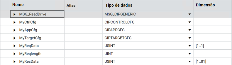- Na grade de variáveis locais, adicione as seguintes variáveis de acordo com a tabela a seguir.Variáveis e tipos de dados na página VariáveisParâmetroNome da variávelTipo de dadosMSG_CIPGENERICMSG_ReadDriveMSG_CIPGENERICCtrlCfgMyCtrlCfgCIPCONTROLCFGAppCfgMyAppCfgCIPAPPCFGTargetCfgMyTargetCfgCIPTARGETCFGReqDataMyReqDataUSINTReqLengthMyReqLengthUINTResDataMyResDataUSINT (matriz)