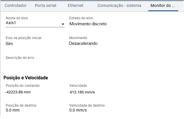 - O estado do eixo muda para Movimento discreto, até que a velocidade seja zero. Quando a velocidade alcançar zero, Concluído é definido como Verdadeiro e o estado do eixo muda para Suspenso.