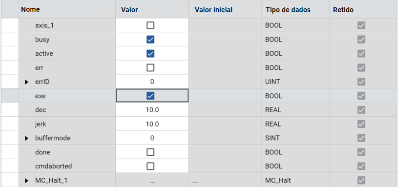 - É possível executar outro comando de movimento durante a desaceleração do eixo, o que cancela o MC_Halt.
