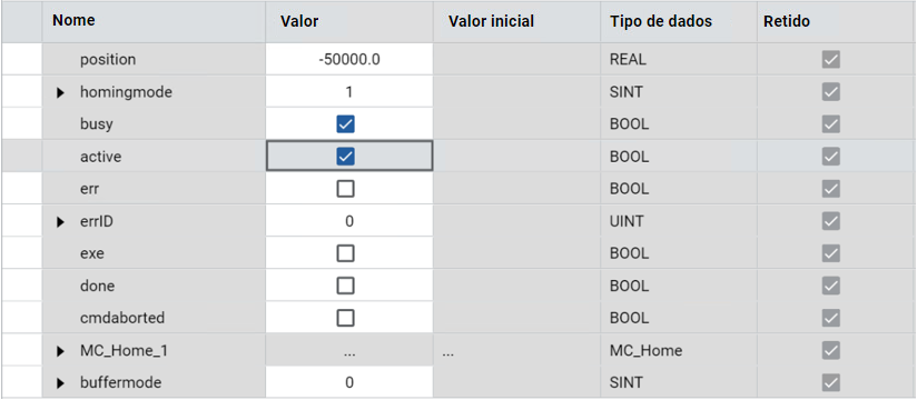 0x04 | MC_HOME_DIRECT | Processo estático de retorno à posição inicial forçando diretamente uma posição inicial de referência do usuário. O bloco de função definirá a posição atual do mecanismo como posição inicial, com sua posição determinada pelo parâmetro de entrada "Posição". |