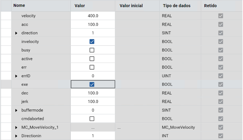 - A saída InVelocity do MC_MoveVelocity permanece True, até que a Velocidade do eixo alcance a Velocidade comandada ou até que MC_MoveVelocity seja cancelado.