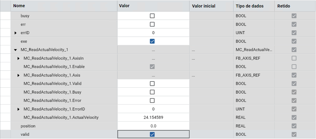 Position | Saída | REAL | O valor da posição real absoluta para o eixo de movimento de feedback. (em unidade do eixo [u]) |