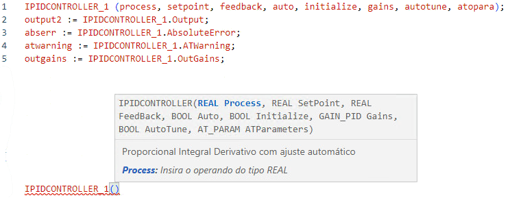 (* ST equivalence: IPIDController1 is an instance of IPIDController block *) IPIDController1(Proc, SP, FBK, Auto, Init, G_In, A_Tune, A_TunePar, Err ); Out_process := IPIDController1.Output ; A_Tune_Warn := IPIDController1.ATWarning ; Gain_Out := IPIDController1.OutGains ;