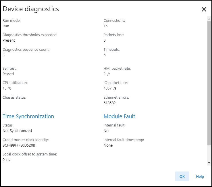 Se houver uma falha de sincronização de tempo, vá para a caixa de diálogo Diagnóstico do dispositivo para verificar o status da sincronização de tempo e a identidade do relógio Grandmaster.