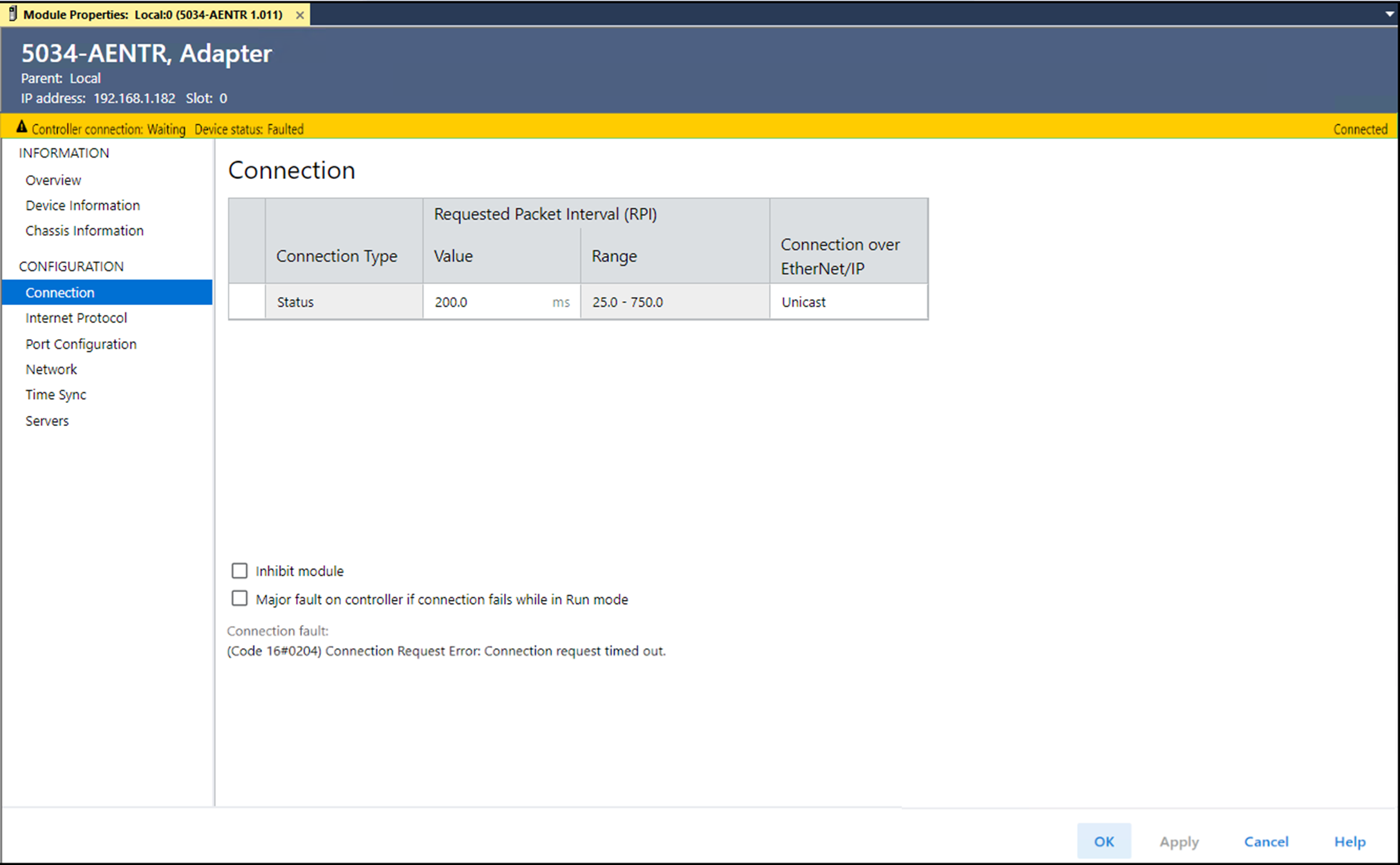 Se houver um ícone de aviso, abra as Propriedades do Módulo e verifique a barra de status para identificar o tipo de falha.