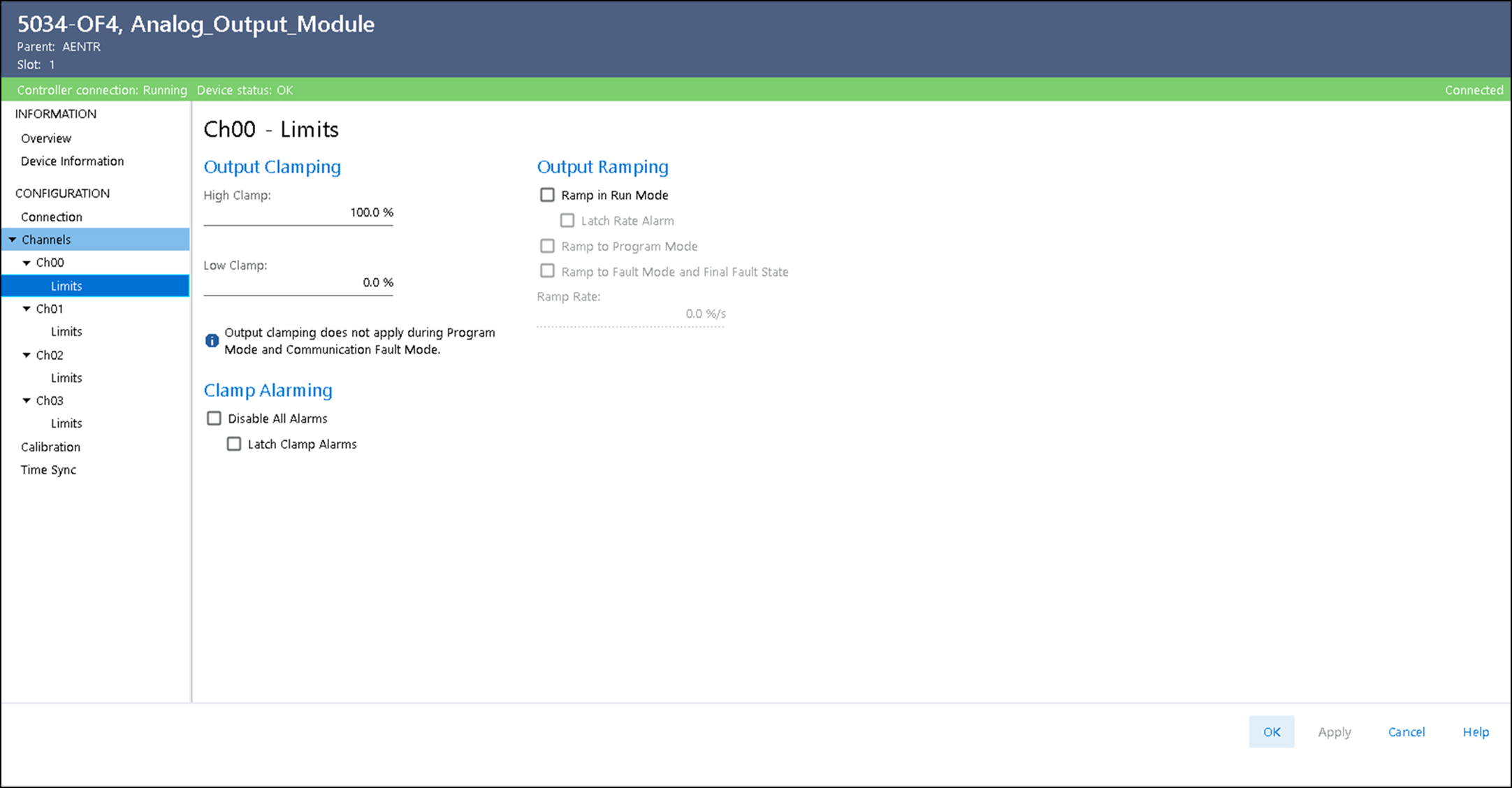 - Habilitar/desabilitar a rampa de saída em diferentes modos e configurar a taxa de rampa (se algum modo de rampa estiver habilitado).