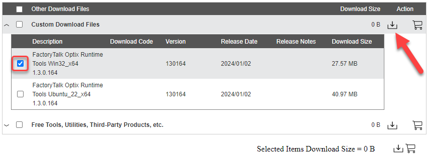 - 选中FactoryTalk Optix Runtime 工具安装包旁边的复选框,然后单击右上角