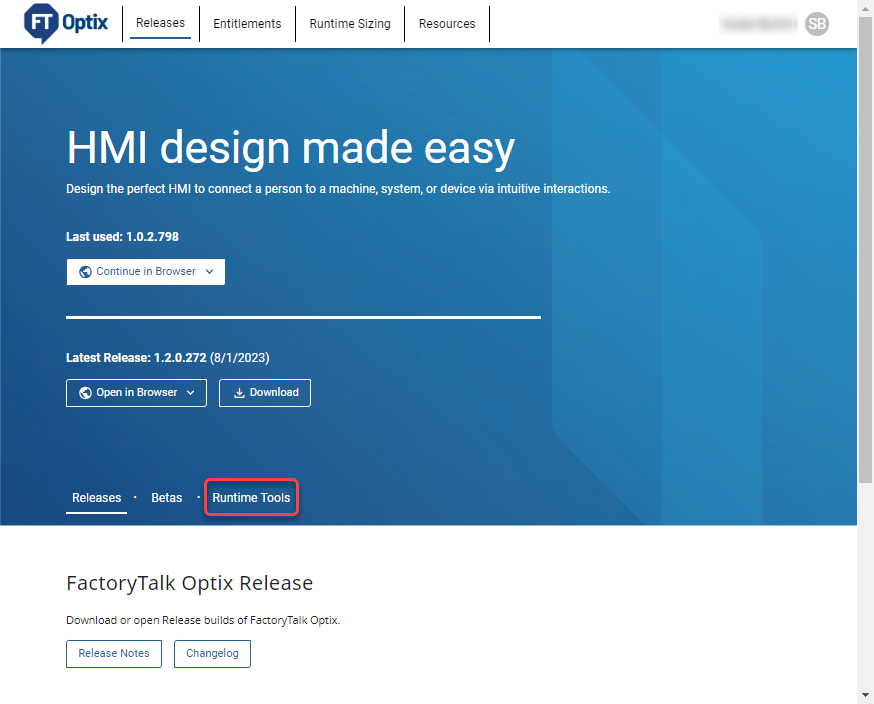 - 在FactoryTalk®Optix™登录页面上,选择运行时工具。