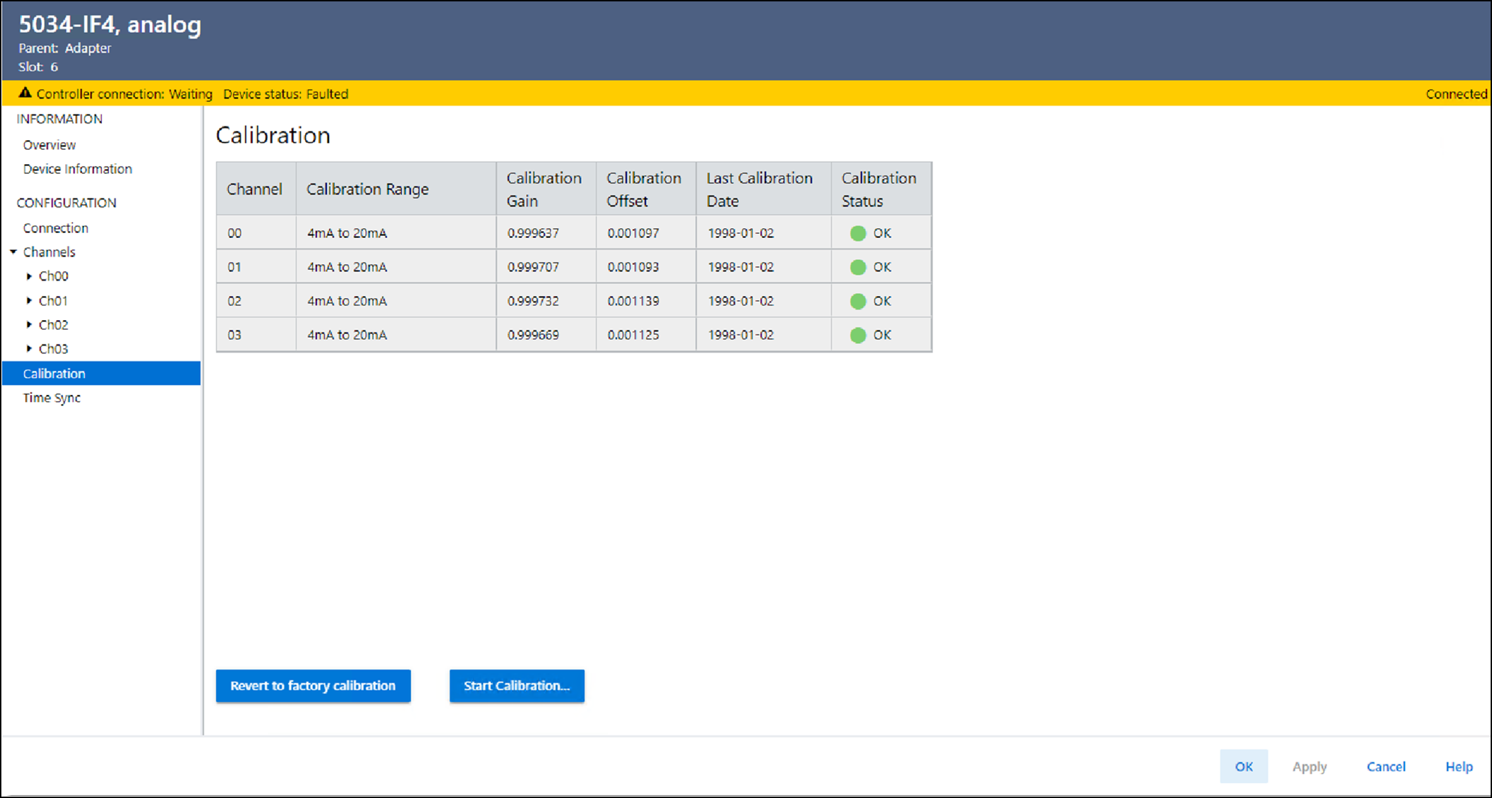 Calibration 视图提供了模块上所有通道的校准信息。 您可以在该视图上对所有通道执行以下操作: