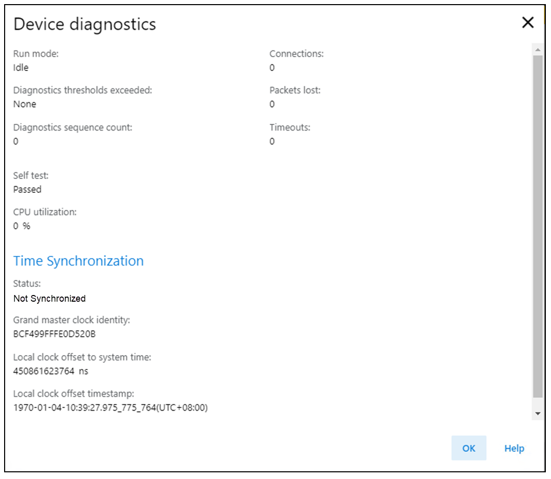 如果存在 Time Sync 故障,请转到 Device Diagnostics 对话框,检查时间同步状态和主时钟标识。